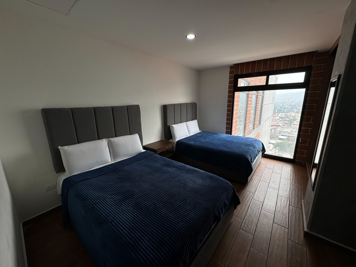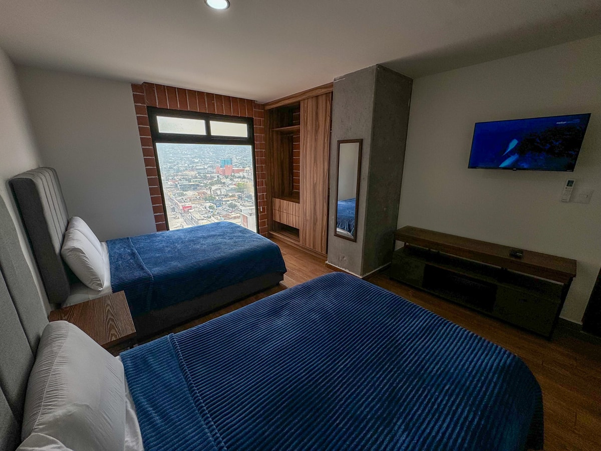 Este acogedor estudio está diseñado para brindar una estancia cómoda y funcional. Cuenta con dos camas matrimoniales, perfectas para descansar y relajarte después de un día en la ciudad. La cocina pequeña está equipada con lo necesario para preparar comidas ligeras, y el baño es moderno y práctico. Además, disfrutarás de inmejorables vistas de la ciudad, que aportan un toque especial y único a tu estancia.