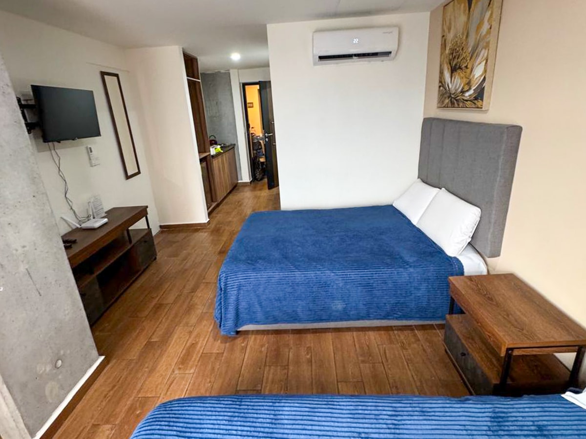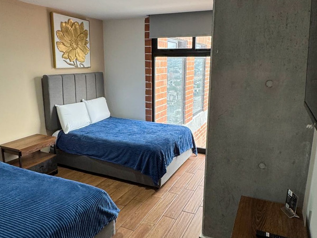 Interior práctico y acogedor: dos camas matrimoniales, baño privado, cocineta equipada para desayunos rápidos. Acceso a rooftop con vistas infinitas y restaurante. Estacionamiento con previa reserva y sujeto a espacio. Silencio, vista y confort.