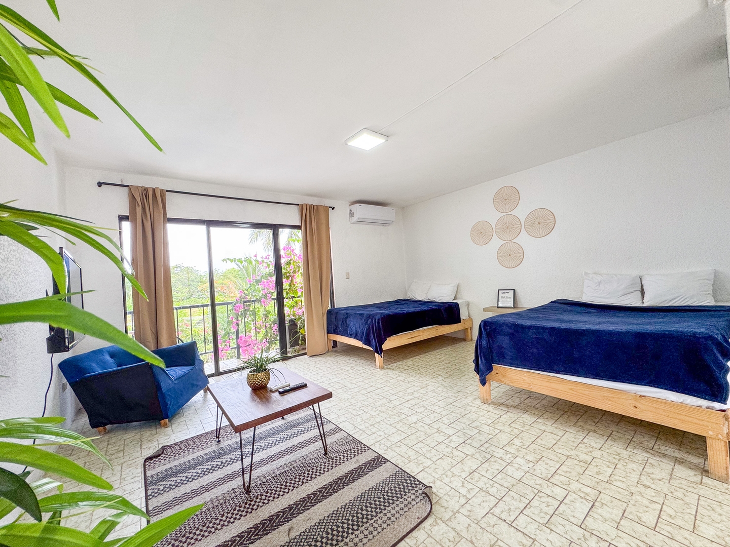 Cada estudio tiene 2 camas matrimoniales, baño privado y cocina equipada. Son espacios independientes que se conectan a través de una terraza común con vista a la alberca y al jardín. Amplios, frescos y funcionales. Perfectos para grupos de hasta 8 personas que buscan privacidad, comodidad y ubicación privilegiada en Cancún.