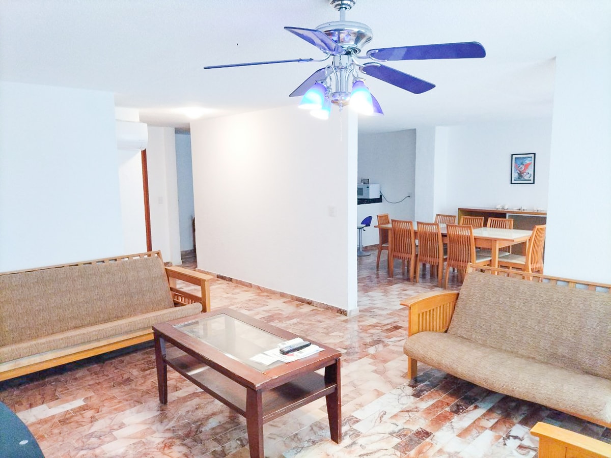 Este departamento de dos pisos cuenta con tres recámaras en la planta alta, cada una equipada con una cama king size. En la planta baja, encontrarás una estancia con sala, comedor, cocina y un balcón con una impresionante vista al mar. Este espacio es ideal para grupos grandes o familias que buscan comodidad y vistas espectaculares en la Zona Hotelera.