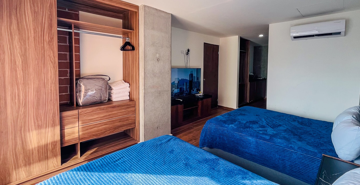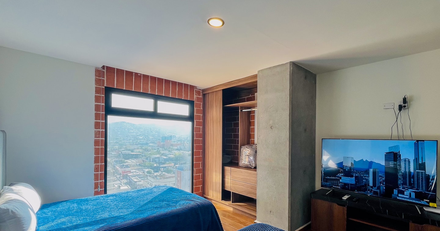 Estudio cómodo y bien iluminado con dos camas matrimoniales, baño privado y cocineta. Ubicado en el piso 14 de un edificio moderno en el corazón del Barrio Antiguo. A solo unos pasos de Paseo Santa Lucía, la Macroplaza y Fundidora. Disfruta de un rooftop con alberca y vistas infinitas al skyline de Monterrey. Ideal para descansar y descubrir la ciudad.