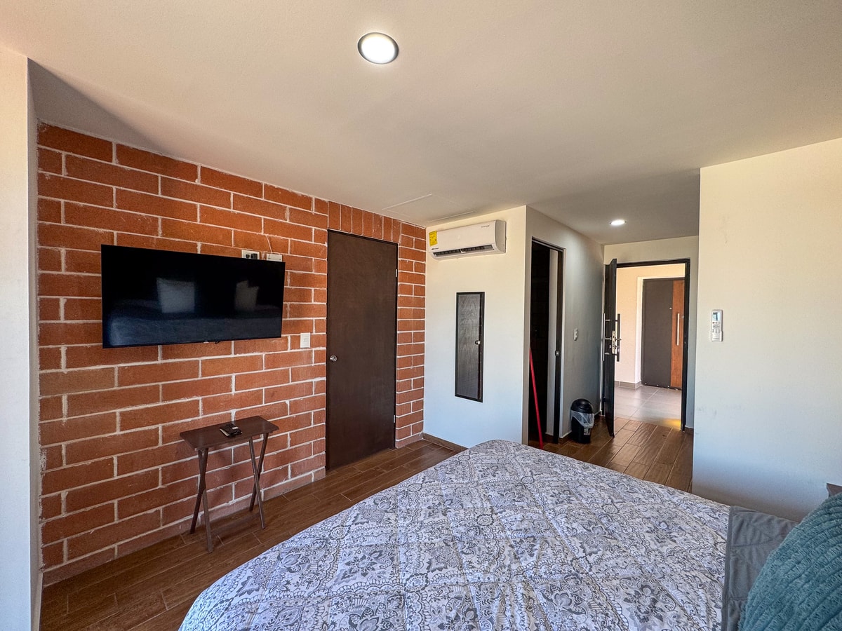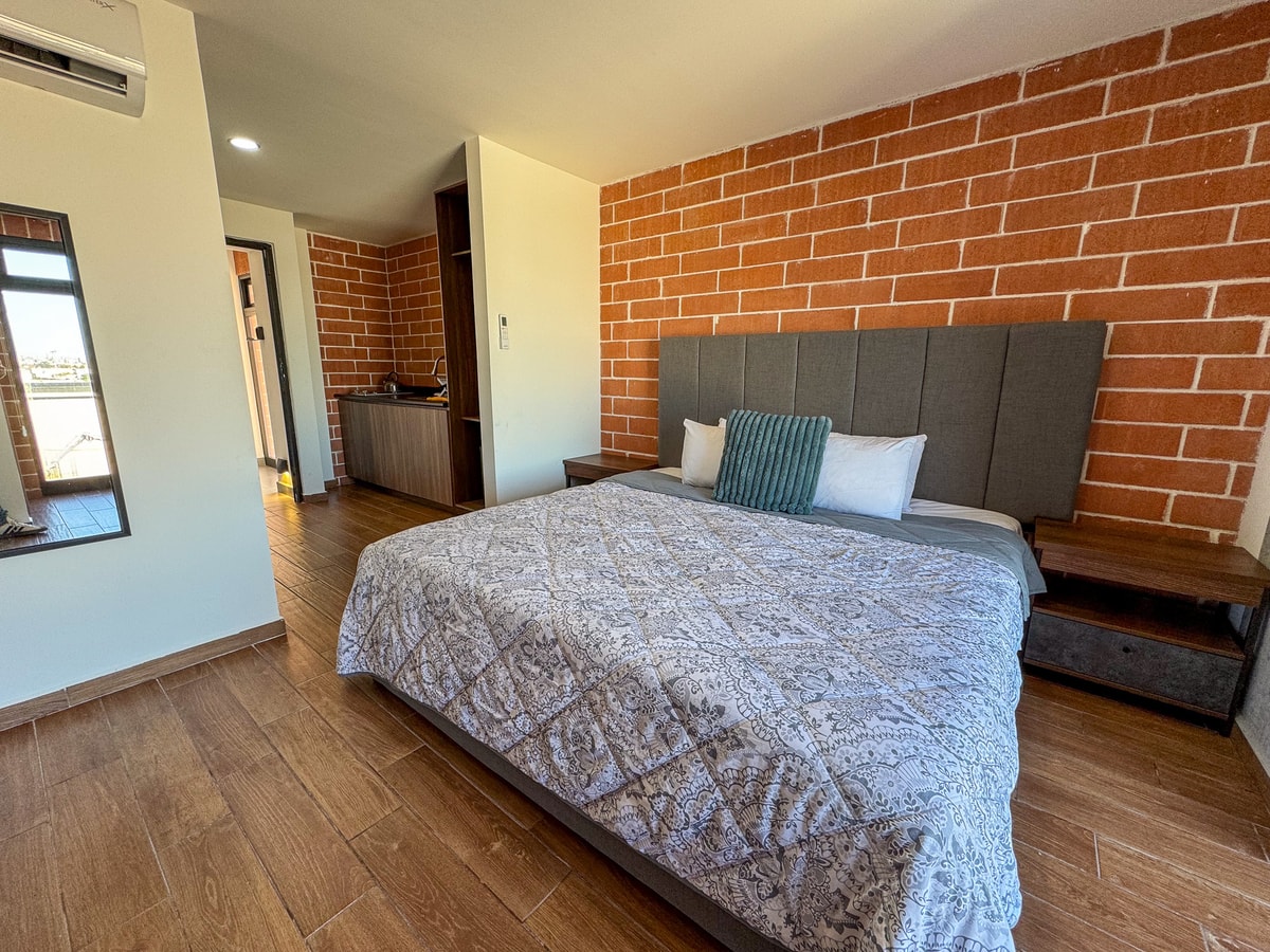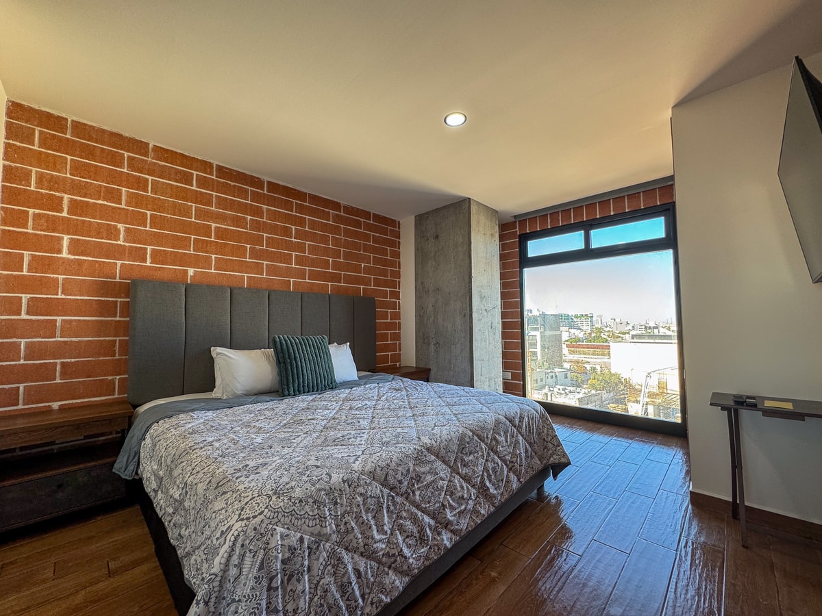 Este elegante estudio está diseñado para ofrecer una experiencia de estancia confortable y moderna. Cuenta con una cómoda cama king-size que garantiza un descanso reparador. La cocina pequeña está equipada con lo esencial para preparar comidas ligeras, y el baño es moderno y funcional. Lo que realmente distingue a este espacio son sus inmejorables vistas de la ciudad, que podrás disfrutar desde la comodidad de tu estudio, creando un ambiente relajante y único.