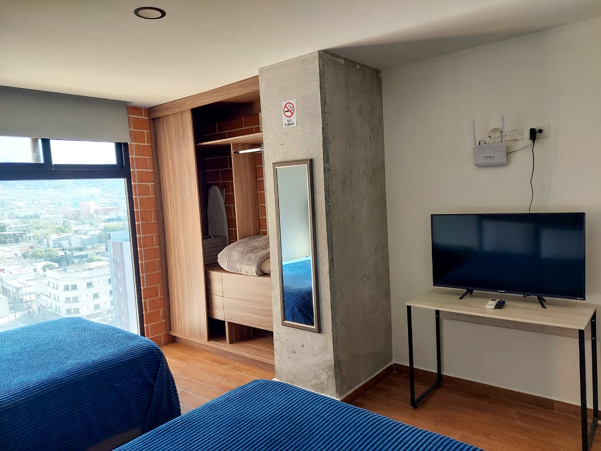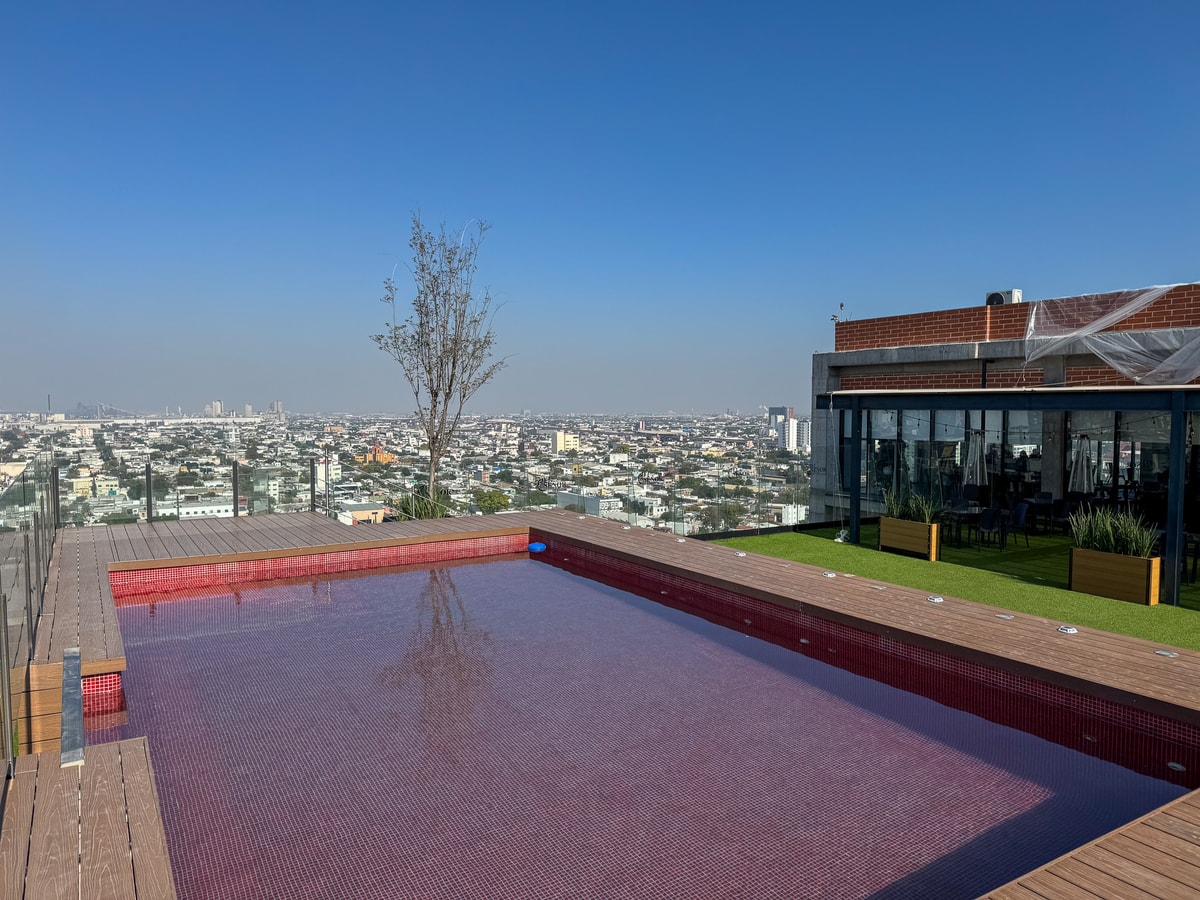 Estudio 1408 combina diseño práctico y ubicación privilegiada. Incluye dos camas matrimoniales, baño privado, cocineta equipada y acceso por elevador. El rooftop con alberca ofrece vistas 360° de la ciudad, ideal para relajarte tras un día explorando.
