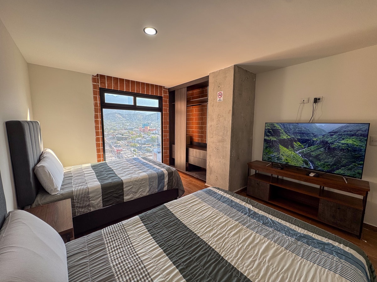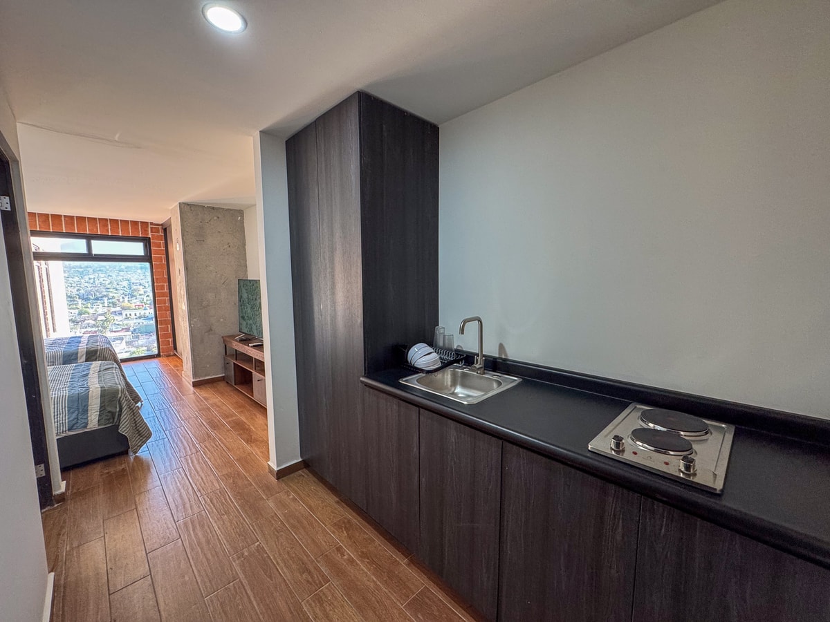 Este acogedor estudio está diseñado para brindar una estancia cómoda y funcional. Cuenta con dos camas matrimoniales, perfectas para descansar y relajarte después de un día en la ciudad. La cocina pequeña está equipada con lo necesario para preparar comidas ligeras, y el baño es moderno y práctico. Además, disfrutarás de inmejorables vistas de la ciudad, que aportan un toque especial y único a tu estancia.