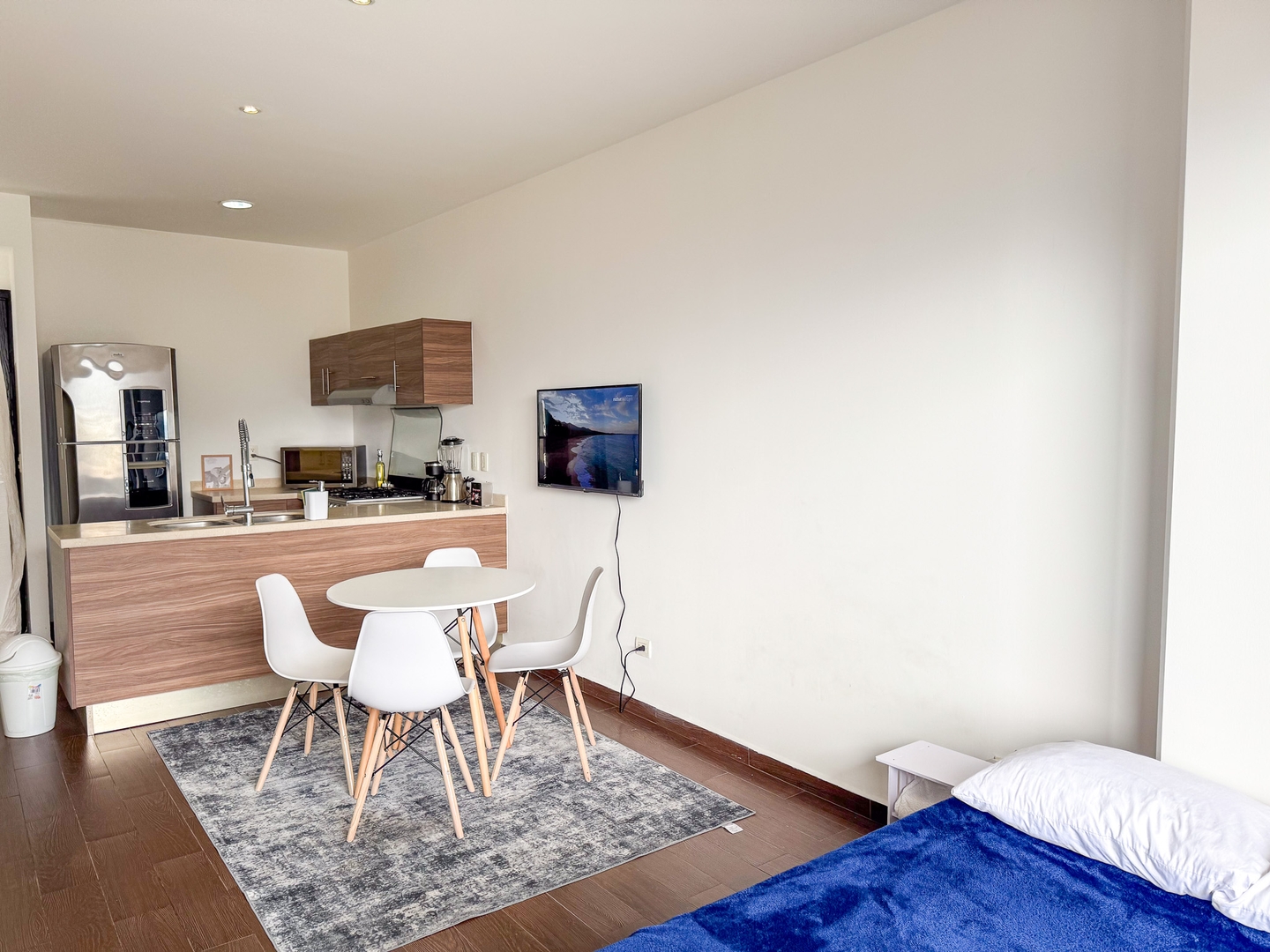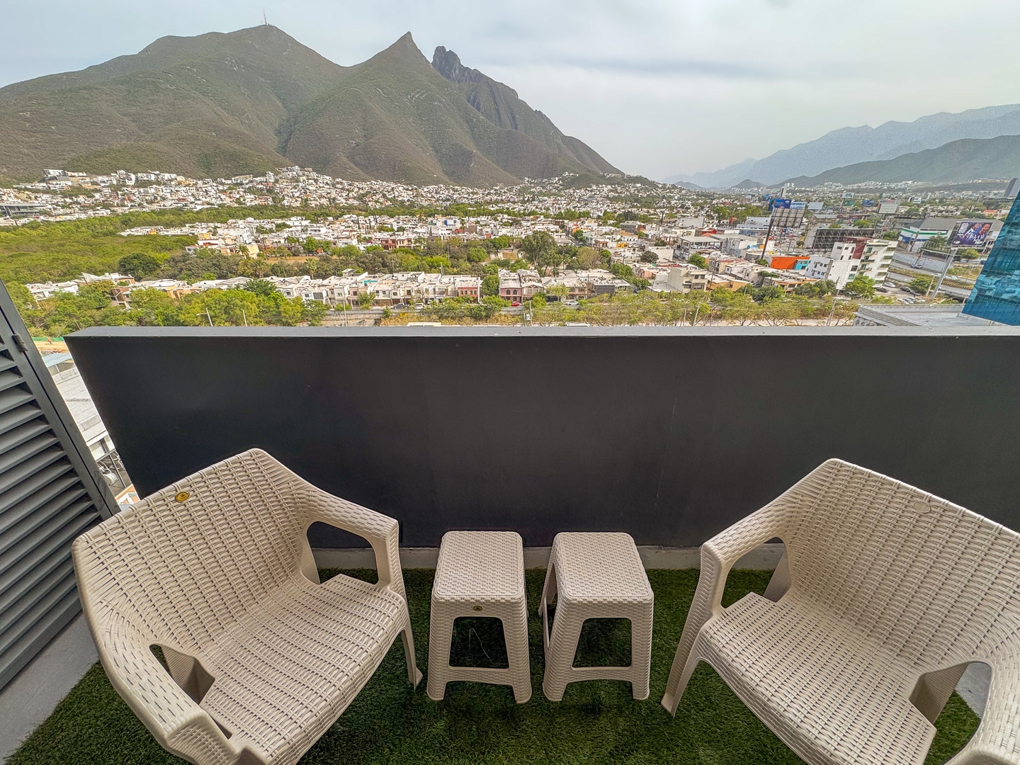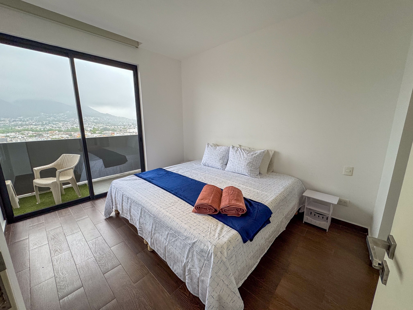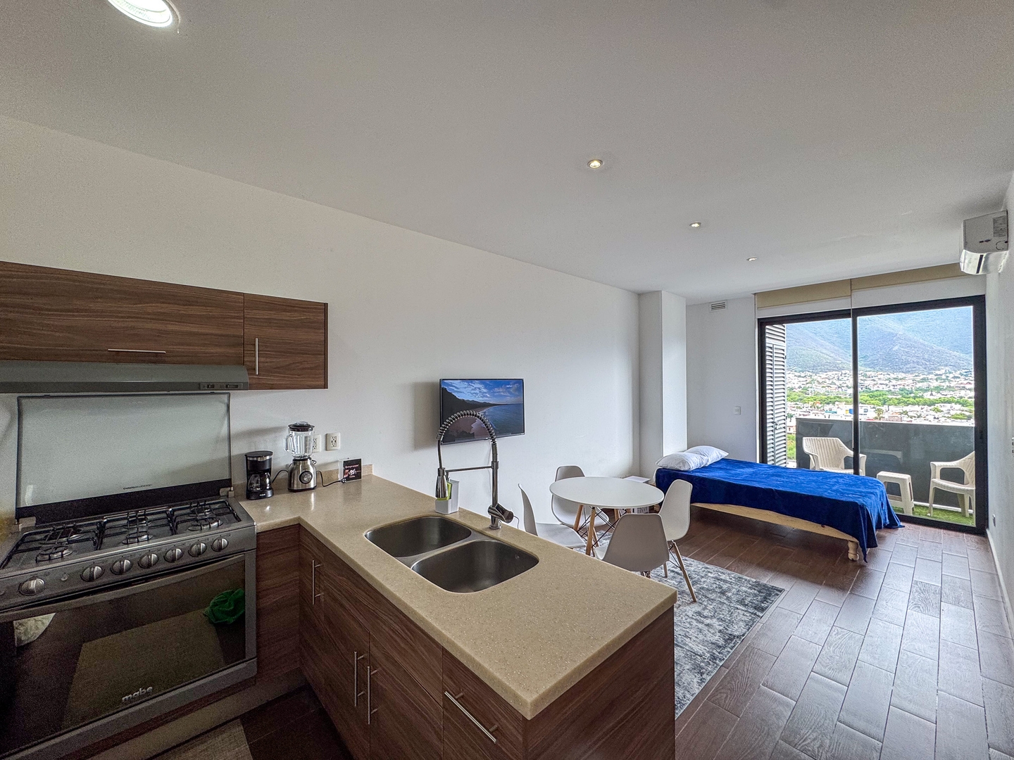 Depa moderno y funcional con una recámara con cama king, una cama matrimonial en la sala, cocina equipada, comedor y balcón con vista directa al Cerro de la Silla. Ideal para 4 personas. Ubicado sobre la plaza Nuevo Sur, con restaurantes, cine y tiendas. A minutos del Tec, Estadio Banorte y Fundidora. Acceso a gym, alberca y parque privado.