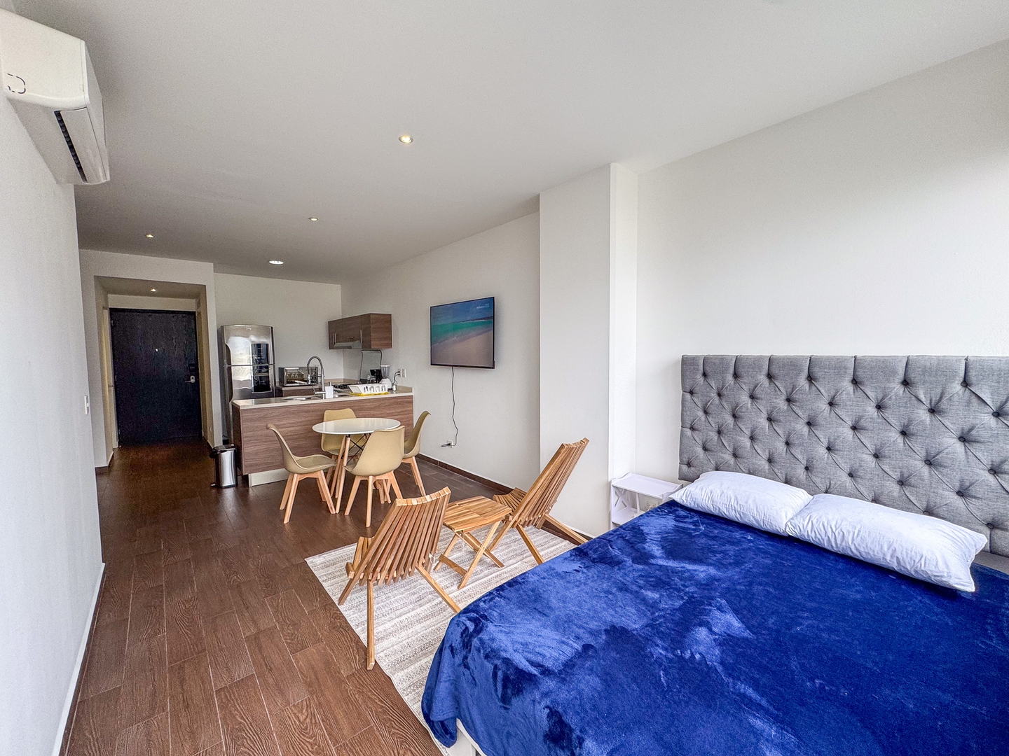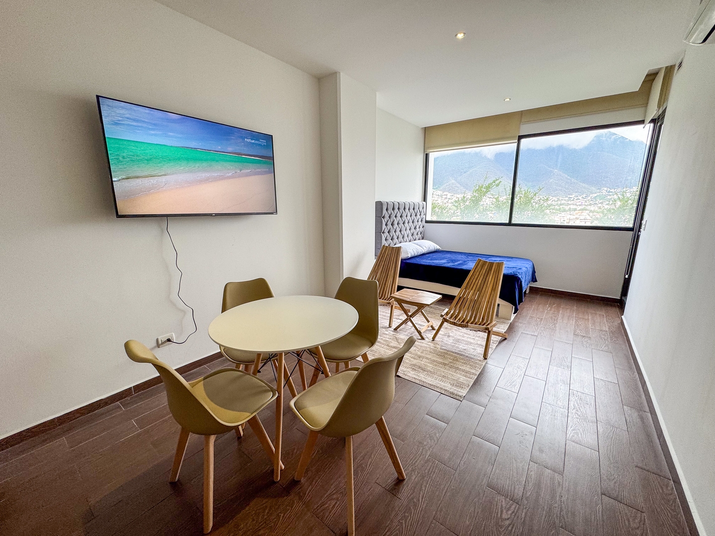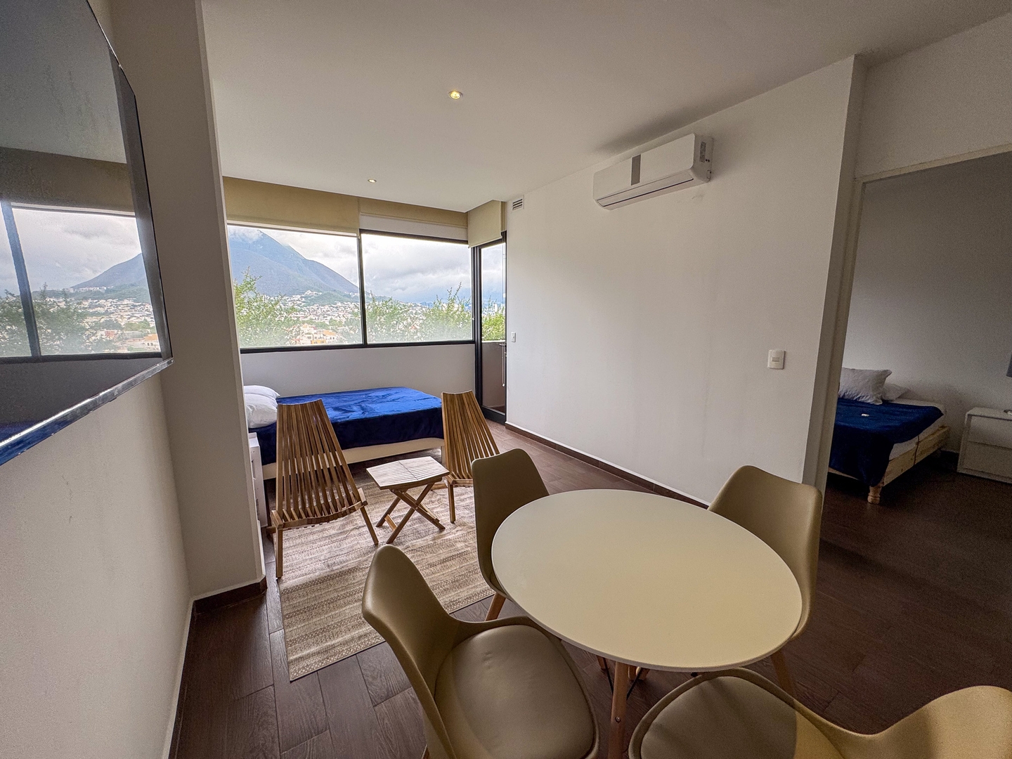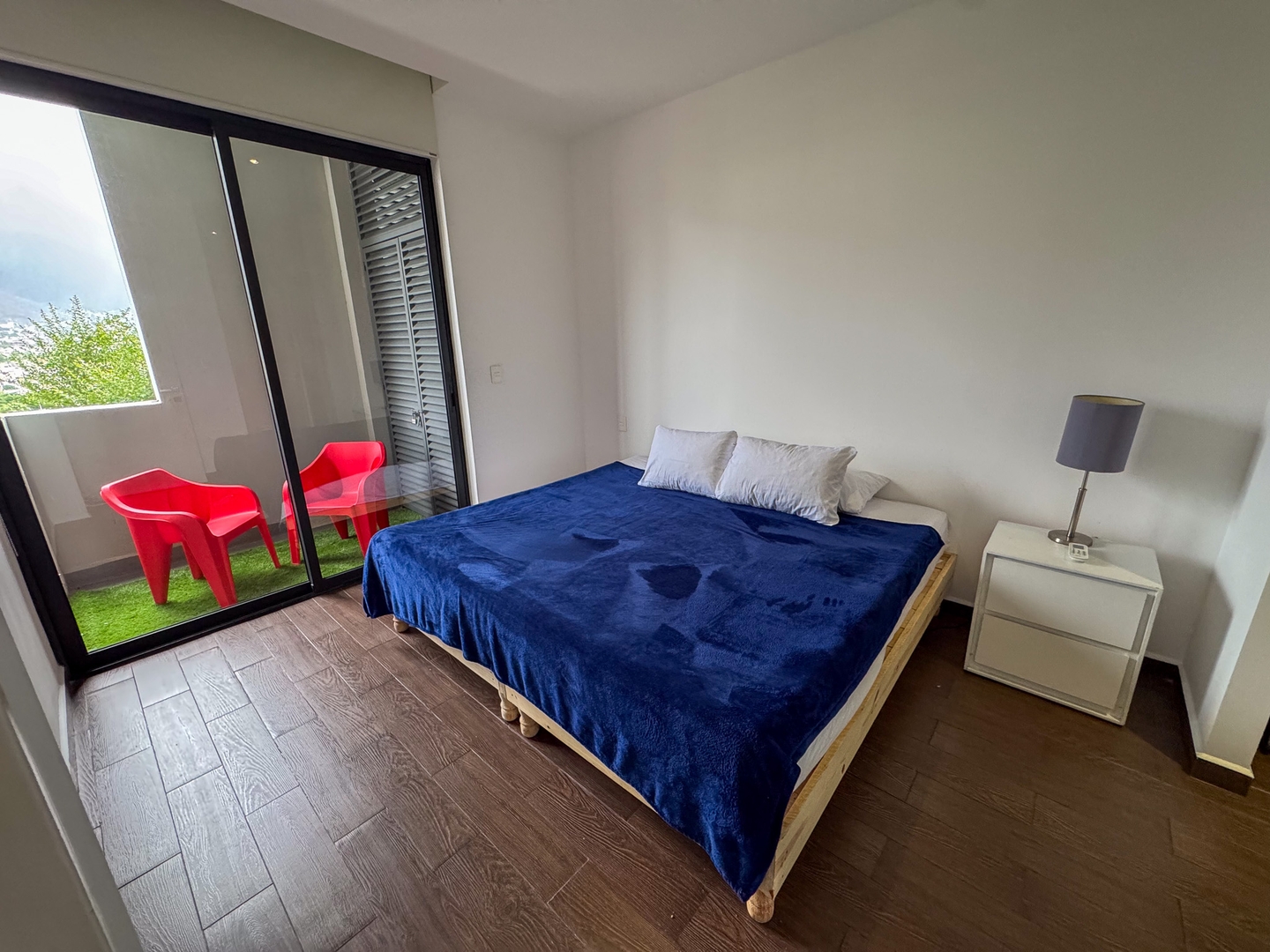 Depa moderno y funcional con una recámara con cama king, dos camas individuales en la sala, cocina equipada, comedor y balcón con vista directa al Cerro de la Silla. Ideal para 4 personas. Ubicado sobre la plaza Nuevo Sur, con restaurantes, cine y tiendas. A minutos del Tec, Estadio Banorte y Fundidora. Acceso a gym, alberca y parque privado.