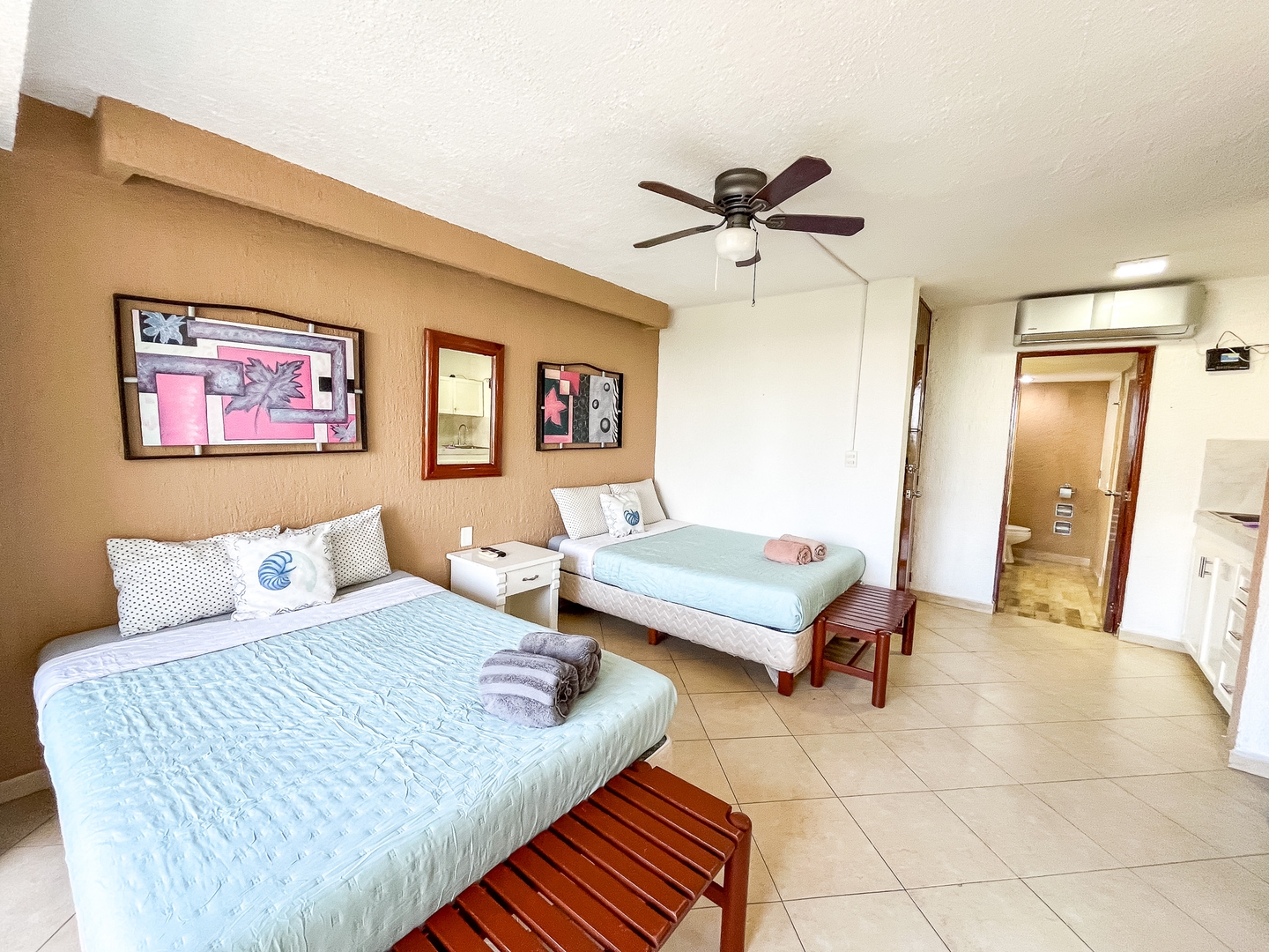 The apartment features two double beds, a private bathroom, TV, and a fully equipped kitchen. Designed for comfort and functionality, it’s ideal for short or extended stays.